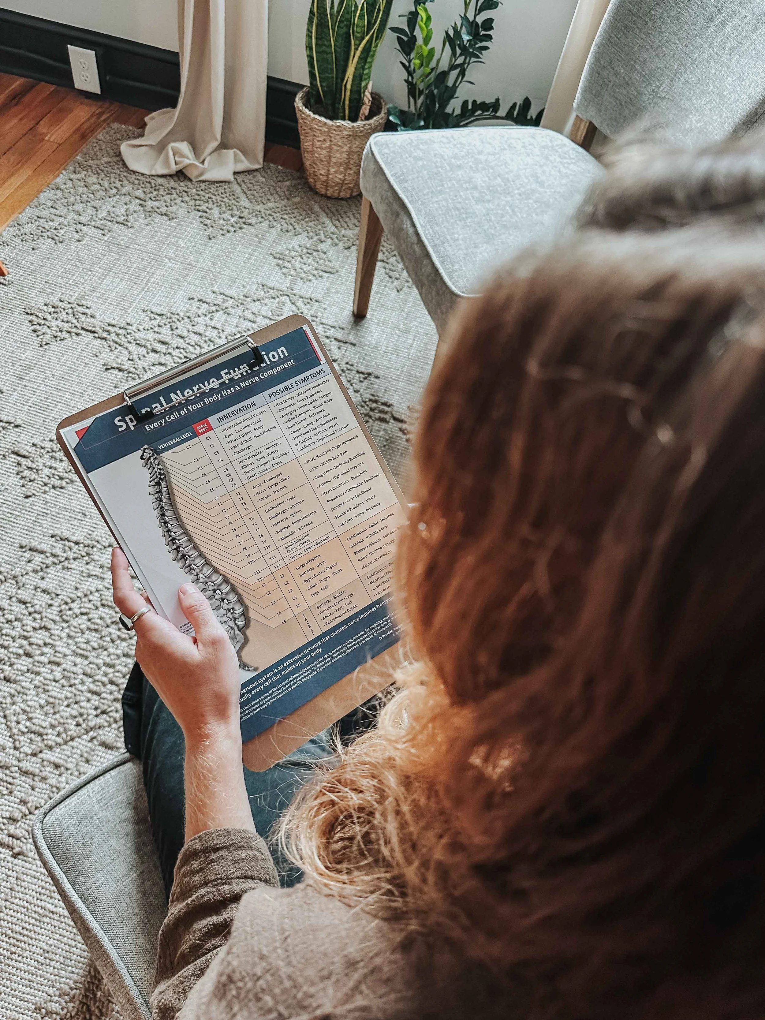 A woman with long wavy blonde hair and glasses sitting on a grey upholstered chair in a room. She is holding a book titled ' seekers. S' with an orange cover. Behind her, there are two framed posters of the spine and nervous system on the wall, and a small wooden side table with a ceramic bowl and some stacked papers. There is a curtain and a floor lamp with a woven shade to the left.